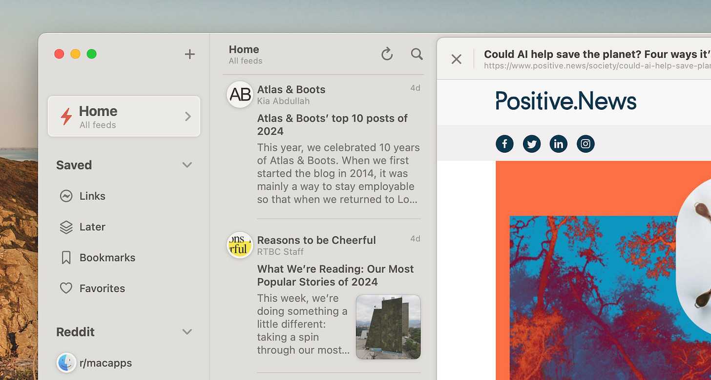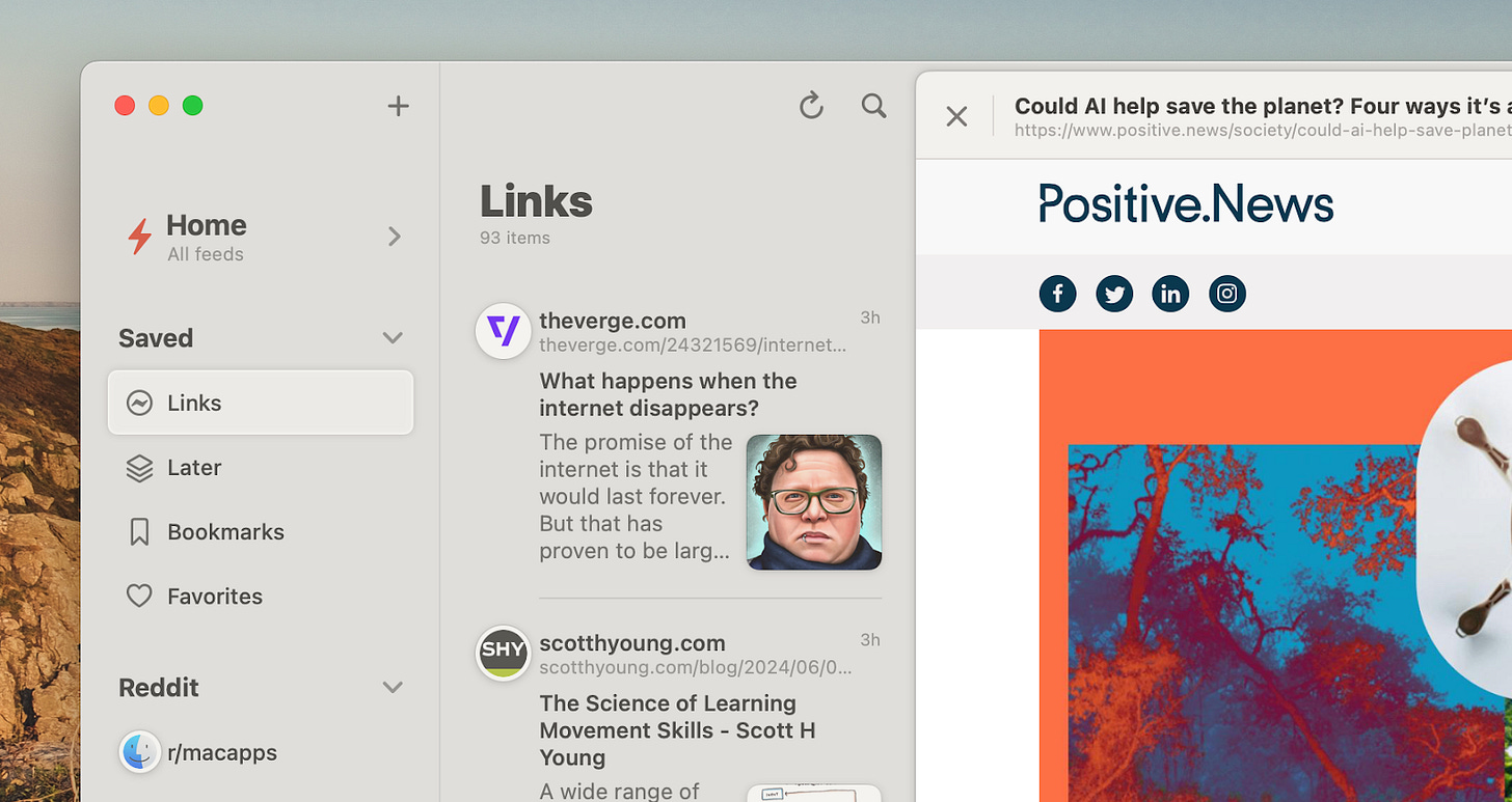That means that I can stash articles I find outside my RSS feeds, such as a newsletter post — into this app. These get saved into a list I can access when I have the time.