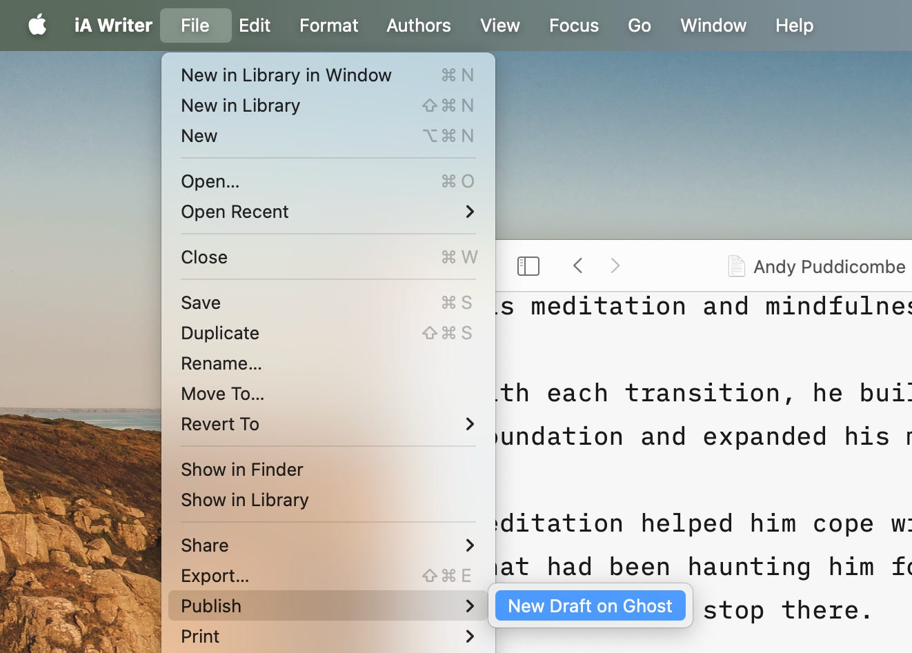 But what I find extremely handy is its Publish feature. Once I’m done writing an article, I can hop over to File → Publish → New Draft on Ghost: