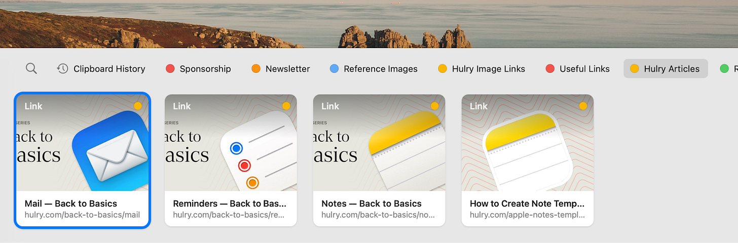 First, I’ve saved a few of my frequently pasted links, code snippets and text into Collections, which I can access anytime by pressing ⌘ + Shift + V: