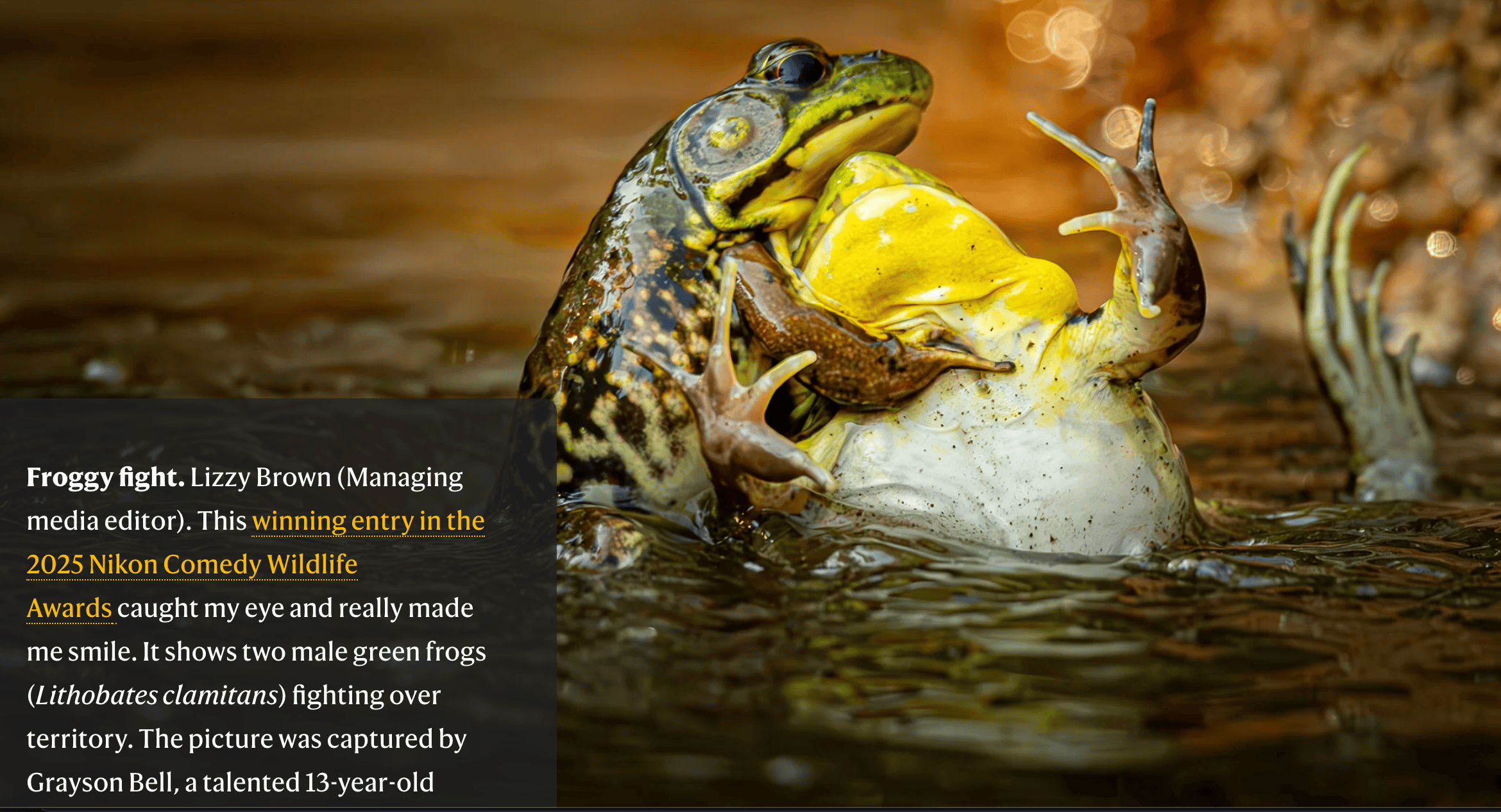 Nature’s Best Science Images of 2025 I stumbled on these delightful images on the wonderfully-curated Kottke.org. The image below, by 13-year-old Grayson Bell, appears in the Nature collection and won recognition from the Comedy Wildlife Awards 2025.